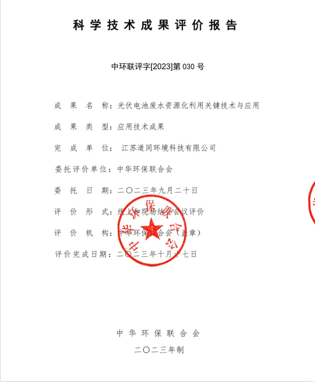 2023年10月17日,中華環(huán)保聯合會在北京組織召開了江蘇道同環(huán)境科技有限公司申請的“光伏電池廢水資源化利用關鍵技術與應用”技術成果評價會。按照國家科技部《科技成果評價試點暫行辦法》等相關規(guī)定和要求,邀請了7位相關專業(yè)領域的專家組成專家評價委員會,咨詢專家委員會確定了由侯立安院士擔任評價委員會主任委員,甘一萍教授擔任副主任委員。評價委員會聽取了技術研發(fā)和應用匯報,審閱了有關技術資料,進行了質詢、答疑和研討、交流后認為該技術成果整體水平上達到國際先進水平,同意通過科技成果評價。